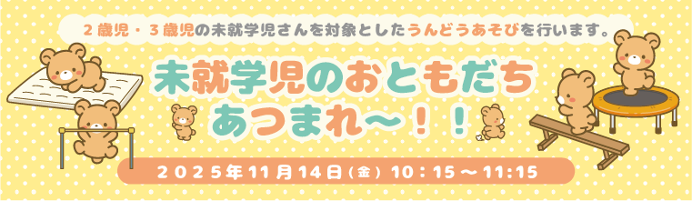 「未就学児のおともだち集まれ~!!」のお知らせを掲載いたします。詳細はこちらをご覧ください。 |