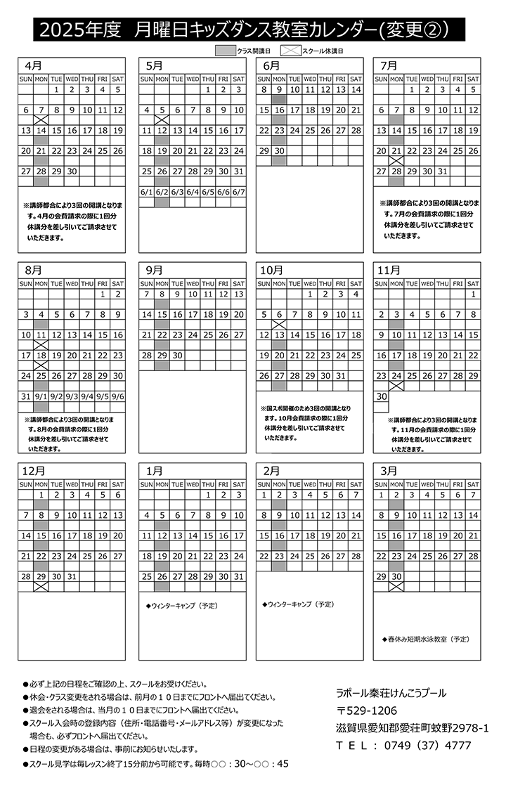 幼児体操 | 土 | 11:15~12:15 | 年少~年長 | 夏季(6月~9月)は水泳教室、 その他(4月~5月・10月~3月)は 体操教室を受講頂くクラスとなります。 ※夏季のみのご入会はできません。 ※夏季期間は同時間に体操教室開講いたしません。 |